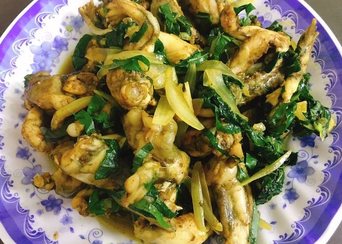 Ếch xào lá lốt (ヒハツとカエル炒め)個